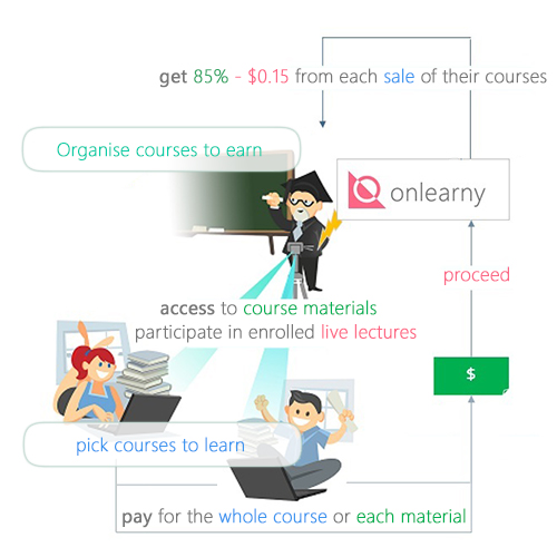 Using PAYG scheme, students only pay for content they need to learn. Similarly, trainers need no prepaid buget and keep 85% - A$0.15 from they courses sales.